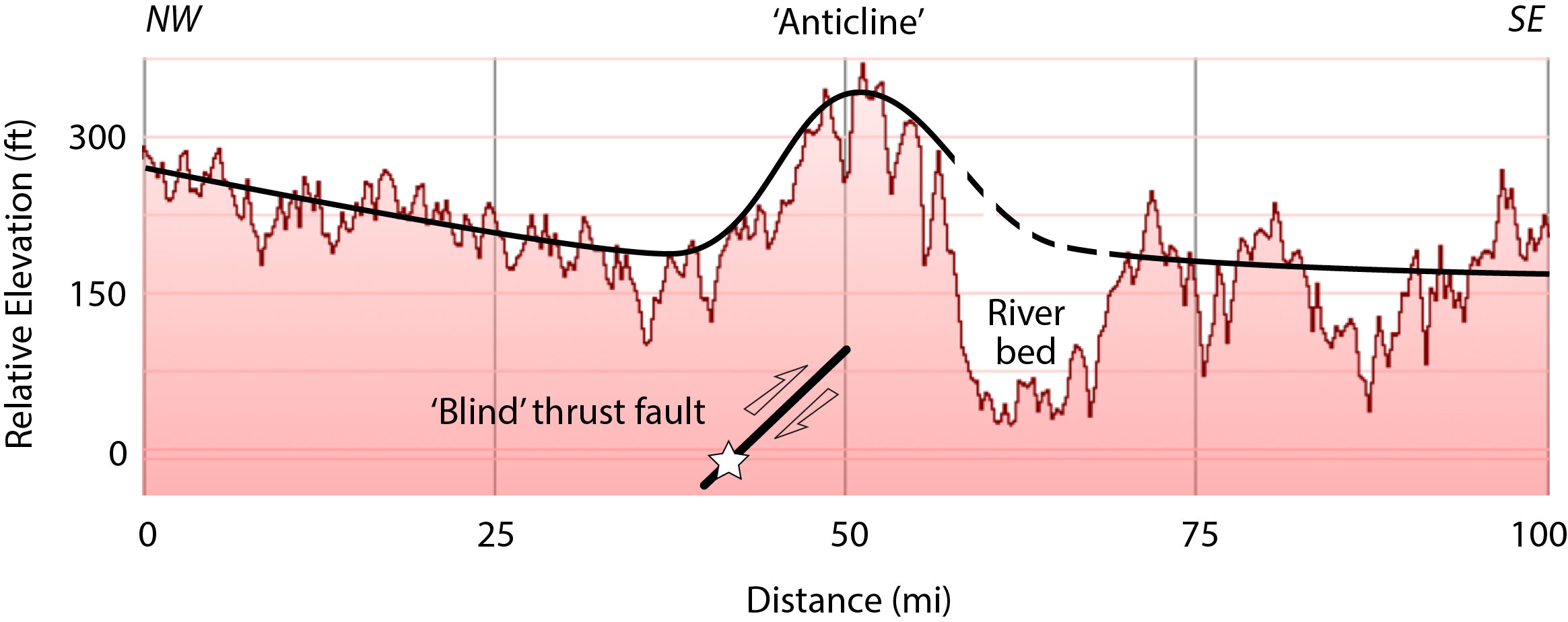 A pesar de que no hay deformación visible de la superficie, con base en los perfiles de elevación de Google Earth, parece haber una protuberancia ubicada aproximadamente a 25 m (75 pies) de altura cerca del epicentro del sismo de ayer (Ver abajo). Mientras que esta protuberancia no se ocasionó por el sismo, podría ser característica de una falla de cabalgamiento ciega que se hunde aproximadamente a 45 grados. Por lo tanto, todas las señales apuntan a que ésa fue la causa del terremoto del 18 de abril.